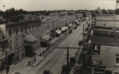 Keywords: outdoor monochrome road Description: Photo postcard of Exeter likely looking north. Visible businesses inclue "Harris Cements Engines", "Central Hotel," "Rex Cafe," "Willard Service Station." Object ID : A997.0026.008 Order a higher-quality version of this item by contacting the Huron County Museum (fee applies). Description: Photo postcard of Exeter likely looking north. Visible businesses inclue "Harris Cements Engines", "Central Hotel," "Rex Cafe," "Willard Service Station." Object ID : A997.0026.008 Order a higher-quality version of this item by contacting the Huron County Museum (fee applies).