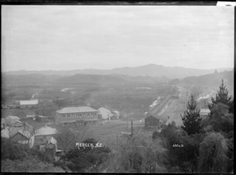 Keywords: blackandwhite monochrome outdoor photo border black and white View looking down from a vantage point to the south east. In the middle distance is the main street with a hotel, and an ironmonger's shop next door. Across the road is the Mercer railway station and the Main Trunk Line heading north. Photograph taken by William A Price in early 1900s. Inscriptions: Inscribed - Photographer's title on negative -bottom centre: Mercer. NZ.bottom right: 2524D. William Archer Price lived and practised in Queen Street, Northcote, 1909-1910. Source: New Zealand Post Office directories Quantity: 1 b&w original negative(s). Physical Description: Dry plate glass negative 4.75 x 6.5 inches Main street of Mercer. Price, William Archer, 1866-1948 :Collection of post card negatives. Ref: 1/2-001037-G. Alexander Turnbull Library, Wellington, New Zealand. natlib.govt.nz/records/22519711 View looking down from a vantage point to the south east. In the middle distance is the main street with a hotel, and an ironmonger's shop next door. Across the road is the Mercer railway station and the Main Trunk Line heading north. Photograph taken by William A Price in early 1900s. Inscriptions: Inscribed - Photographer's title on negative -bottom centre: Mercer. NZ.bottom right: 2524D. William Archer Price lived and practised in Queen Street, Northcote, 1909-1910. Source: New Zealand Post Office directories Quantity: 1 b&w original negative(s). Physical Description: Dry plate glass negative 4.75 x 6.5 inches Main street of Mercer. Price, William Archer, 1866-1948 :Collection of post card negatives. Ref: 1/2-001037-G. Alexander Turnbull Library, Wellington, New Zealand. natlib.govt.nz/records/22519711