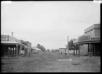 | Keywords: blackandwhite monochrome outdoor photo border road architecture building black and white Photograph by William Archer Price in early 1900s. View looking down Tuakau Road, Tuakau. Shows wooden commercial buildings lining the street including Green & Colebrook Ltd, Tapper Bros, a fruiterer, Tuakau Hotel, Clifton House and the premises of Mrs Moor. Inscriptions: Inscribed - Photographer's title on negative -bottom right: Tuakau Road. 2093. Quantity: 1 b&w original negative(s). Physical Description: Glass negative Main street, Tuakau township. Price, William Archer, 1866-1948 :Collection of post card negatives. Ref: 1/2-001521-G. Alexander Turnbull Library, Wellington, New Zealand. natlib.govt.nz/records/22883149 Photograph by William Archer Price in early 1900s. View looking down Tuakau Road, Tuakau. Shows wooden commercial buildings lining the street including Green & Colebrook Ltd, Tapper Bros, a fruiterer, Tuakau Hotel, Clifton House and the premises of Mrs Moor. Inscriptions: Inscribed - Photographer's title on negative -bottom right: Tuakau Road. 2093. Quantity: 1 b&w original negative(s). Physical Description: Glass negative Main street, Tuakau township. Price, William Archer, 1866-1948 :Collection of post card negatives. Ref: 1/2-001521-G. Alexander Turnbull Library, Wellington, New Zealand. natlib.govt.nz/records/22883149 |