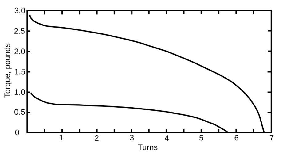 | Keywords: Mainspring torque curves.svg  Graph of torque exerted by two pocketwatch mainsprings enclosed in mainspring barrels as they unwind Traced from graph originally from 1879 watchmaking book by Claudius Saunier The vertical scale units were labelled as 'pounds' in the text although they represent torque The horizontal units are revolutions of the mainspring barrel from fully wound at left The curves illustrate the benefit of the going barrel in providing more constant torque to the watch's movement improving timekeeping The torque of a free mainspring outside a barrel declines in a straight line to zero as it unwinds The effect of the enclosing barrel seen especially in the lower curve is to create a 'flattened' section in the torque curve providing roughly constant torque to the watch's gears over the running time of the watch until the spring is nearly unwound Alterations to image Traced curves from original image of graph horizontally reversed curves to place fully wound side on left Original graph downloaded December 4 2007 from http //books google com/books id _GIFAAAAQAAJ pg PA679 Edward Rigg 1889 Watchmaking Journal of the Royal Society of Arts Bell Sons London Vol 29 p 679 on Google Books originally from Claudius Saunier 1879 Treatise on Modern Horology in Theory and Practice translated by J Tripplin and E Rigg Claudius Saunier 1879 Public domain - Saunier died 1896 PD-old Mainspring |