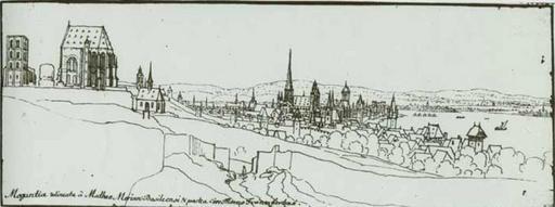 | Keywords: Mainz1631.jpg Mainz von Südosten aus gesehen vor Dezember 1631 Federzeichnung von Wenzel Hollar Blick vom Michelsberg auf St Alban und die Stadt samt Vorstadt Vilzbach und den Rhein Der Dom trägt den hohen gotischen Helm auf dem Westturm das gotische Geschoss mit der späteren Laterne auf der Ostgruppe Rechts vom Dom St Maria ad Gradus davor der mittelalterliche Vorgängerbau der Ignazkirche mit gotischem Doppelturm Gut erkennbar auch der dem Holzturm baugleiche Zollturm Stadtarchiv Mainz 2007-07 Upload von Martin Bahmann s u PD-old Prints by Wenzel Hollar 1631 in Mainz |
