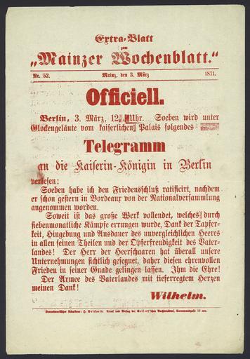 Keywords: Mainzer Wochenblatt, 1871-03-03, Nr. 52, Extrablatt.jpg Extrablatt Mainzer Scan vom Original Bernd Schwabe in Hannover 1871-03-03 differents PD-old-100 1871 newspapers Special edition newspaper Franco-Prussian War