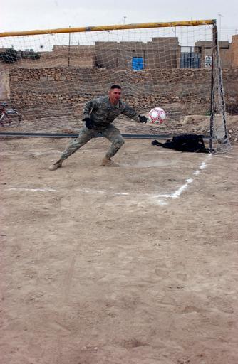 Keywords: Maj. Masaracchia Reaches for a Soccer Ball DVIDS11961.jpg en Maj Charles Masaracchia the air operations officer for the 2nd Battalion 325th Airborne Infantry Regiment 82nd Airborne Division reaches for a soccer ball while playing soccer with some members of the Iraqi Security Force in Tall Afar Iraq Nov 5 2005 U S Army photo by Pfc James Wilt 2005-11-05 Staff Sgt James Wilt https //www dvidshub net/image/11961 11961 2005-11-07 15 29 TAL AFAR IQ PD-USGov 82nd Airborne Division Images from DoD uploaded by Fæ Tal Afar