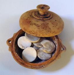 | Keywords: Make-up box KAM Athens 15539.jpg Make-up pot with molded tablets of white lead all having the same diameter and weight 2 75 cm and 5 5 g Found in a tomb from the 5th c BC Pot à fard contenant des pastilles moulées de blanc de céruse de diamètre et de poids identiques 2 75 cm et 5 5 g Trouvé dans une tombe du Ve s av J -C Museum Kerameikos Archaeological Museum object history credit line accession number Inv 15539 User Bibi Saint-Pol own 2009-08-16 Photographie prise à l'exposition « Le Bain et le Miroir » du Musée de Cluny other versions <gallery> File Make-up boxes KAM Athens 15598;15539;15537 jpg Full view </gallery> Ancient Greek cosmetics Ancient Greek pottery pyxides Ancient Greek pottery in the Kerameikos Archaeological Museum Athens Le Bain et le Miroir exhibition 5th-century BC pottery in Athens Lead paint |