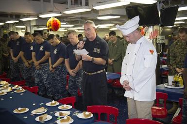 Keywords: Makin Island Celebrates Thanksgiving 161124-N-FP535-043.jpg en 161124-N-FP535-043 INDIAN OCEAN Nov 24 2016 USS Makin Island LHD 8 Commanding Officer Capt Mark Melson right and Sailors and Marines aboard the amphibious assault ship bow their heads as Makin Island Chaplain Cmdr Thomas Ianucci delivers a prayer before Thanksgiving Day dinner on the ship ™s mess decks Makin Island the flagship of the Makin Island Amphibious Ready Group with the embarked 11th Marine Expeditionary Unit celebrated Thanksgiving while underway in the U S 7th Fleet area of operations in support of security and stability in the Indo-Asia-Pacific region U S Navy photo by Lt David Gardner/Released Unit Navy Media Content Services DVIDS Tags Makin Island; Thanksgiving; NMCS; DVIDS Bulk Import 2016-11-24 Lt David Gardner https //www dvidshub net/image/3016592/makin-island-celebrates-thanksgiving 161124-N-FP535-043 2016-11-29 00 14 PD-USGov-Military-Navy USS Makin Island LHD-8 11th Marine Expeditionary Unit Images from DoD uploaded by Fæ