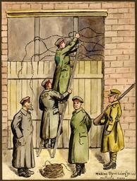 | Keywords: university of victoria universityofvictoria uvic great britain. army. royal regiment of artillery greatbritainarmyroyalregimentofartillery caricatures and cartoons--20th century caricaturesandcartoons20thcentury notebooks war artists warartists world war, 1914-1918--pictorial works worldwar19141918pictorialworks world war, 1914-1918--caricatures and cartoons worldwar19141918caricaturesandcartoons drawing people vehicle bike surreal photo border Item is one of 123 pen-and-ink drawings and watercolours from two volumes titled: "Sketches of the War: France/Belgium". The sketches vary from satirical cartoons to more detailed and naturalistic renditions. They are often accompanied by an ironic title and are often signed with the artist's initials, "J.M." The artist's satirical targets include the officers and high command of both combatant sides; the disjuncture between reported and actual events, and the death of civilians as a fact of modern warfare. Item is one of 123 pen-and-ink drawings and watercolours from two volumes titled: "Sketches of the War: France/Belgium". The sketches vary from satirical cartoons to more detailed and naturalistic renditions. They are often accompanied by an ironic title and are often signed with the artist's initials, "J.M." The artist's satirical targets include the officers and high command of both combatant sides; the disjuncture between reported and actual events, and the death of civilians as a fact of modern warfare. |