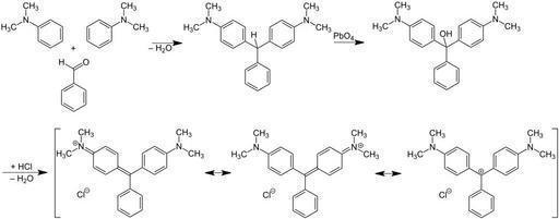 Keywords: Malachite green Synthesis V.1.svg en Malachite_green_Synthesis de Malachitgrün Synthese own Jü 03/07/2010 Malachite green