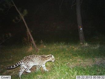 | Keywords: outdoor [UA Ocelot 2013 05-22.jpg] Male ocelot photographed by automatic wildlife cameras in the Huachuca Mountains on May 22, 2013 as part of a U.S. Fish and Wildlife Service/Department of Homeland Security-funded jaguar survey conducted by University of Arizona. This ocelot was first photographed in February 2011. Photo Courtesy of UA/USFWS [UA Ocelot 2013 05-22.jpg] Male ocelot photographed by automatic wildlife cameras in the Huachuca Mountains on May 22, 2013 as part of a U.S. Fish and Wildlife Service/Department of Homeland Security-funded jaguar survey conducted by University of Arizona. This ocelot was first photographed in February 2011. Photo Courtesy of UA/USFWS |