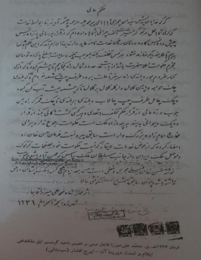 | Keywords: Malekshahi 9090.jpg سند فتح نامه پهلوان موسی خمیس گرزدین وند و ایل ملکشاهی اعطایی فتحعلی شاه قاجار از سوی شاهزاده محمد علی میرزا قاجار به پاس غلبه بر سپاه امپراتوری عثمانی own 1236 هجری قمری shahi 12 PD-Iran Documents of Iran Fat h Ali Shah Qajar Malekshahi county |