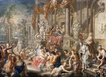 | Keywords: Måleri. Genrebild. Platzer - Skoklosters slott - 88955.tif Signerad J B G Plazer <br/>Badande män och kvinnor i damm framför palats trappa med åskådare och lutspelare samt svart man iskänkande vin Figurrik scen <br/>Plåten fästad under träram Förgylld profilerad ram med bladornament Ramlistens bredd 50 mm <br/>Skrivet på papperslapp LV under krona och N 151 <br/><br/>Fountain scene in front of a palace <br/>This painting like Dancing scene with palace interior inv no 3216 also depicts a scene of bacchanalian inspiration Here half naked figures are seen interacting in a fountain in front of a palace The erotic expression of the figures in a combination with the visual attributes like pearls clearly corresponds with earlier depictions of the myth of Venus However as the painting is made as a twin to Dancing scene with palace interior it is possible that this motif like the other derives from the Odyssey original caption Måleri Genrebild Platzer<br/> Nyckelord Målning Föremålsbild Barocken decade 1730 oil on canvas size mm 665 480 SKO Lovisa Ulrika av Sverige LV place of origin original filename sm_dig3525 24528 inventory number SKO 3215 88955 PD Jens Mohr Jens Mohr Bathing in art Media contributed by LSH unmatched objKeyword Media contributed by LSH unmatched creator Media contributed by LSH 2013-10 |