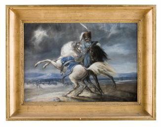 | Keywords: Måleri. Hästporträtt - Skoklosters slott - 87330.tif En husar på svart häst fångar en vit häst utan ryttare <br/>I bakgrunden flera ryttare berglandskap molnig himmel med blixt <br/>Papp som bakre stöd klistrat med franskt tidningspapper Le Figaro från 1880-talet <br/>Förgylld profilerad ram med pastellagelist bredd 80 mm Glas <br/>Signatur C F Kiörbo 1826 original caption Måleri Hästporträtt SKO 11568<br/> Nyckelord Ram Häst Pastell Målning Husarer Romantiken Föremålsbild Kiörboe 1826 oil on canvas circa size mm 520 360 SKO Trofast - hov och tass i kunglig tjänst 2010-2011 Livrustkammaren place of origin original filename sm_dig4967_11568 32584 inventory number SKO 11568 87330 PD Jens Mohr Jens Mohr Horses in art 1826 paintings 19th-century paintings of horses Media contributed by LSH unmatched creator Media contributed by LSH unmatched keyword Media contributed by LSH 2013-10 |