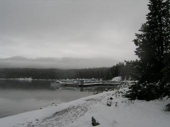 Keywords: boat winter snow Jasper National Park Alberta Canada Maligne Lake dock landscape