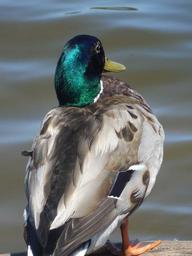 Keywords: mallard duck drake bird wildlife nature animal water wild waterfowl male green feather lake brown fowl beak bill wing head natural avian orange outdoors white log floating resting