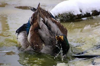 Keywords: mallard male drake plumage fluffed up colorful swim bill feather water snow wash paddling inject nature pond liner artificial duck pond