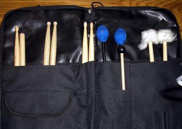 Keywords: Mallet bag.JPG en mallet bag to store mallets and drum sticks Shows a wide variety of sticks Own ZooFari 2008-06-15 Keyboard mallets Orchestral percussion mallets and beaters Mallet bags Drumsticks