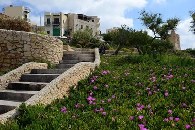Keywords: malta gozo stairs gradually building green purple flowers grass trees sky stone