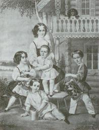 | Keywords: Maltsov by Hau.jpg  ru Дети Се гея Ивановича  альцова 1810-1898 от б ака с княж Анастасией  иколаевной У усовой 1820-1894 Капитолина 1839-после 1918 в пе вом б аке кн  еще ская;  а ия 1942-1904 в замуж кн У усова; Се гей 1845-1908 ; Иван 1846-1920 ;  иколай 1849-1938 скан из книги В И Гау Русский каме ный по т ет Фототипия с литог афии Ф Шевалье по о игиналу аква ели В И Гау 1851/1852 PD-old-100-1923 Family portraits by Vladimir Hau House of Maltsov House of Mescherskiy House of Urusov Portraits of siblings 19th-century oil portraits of children Females with dogs in art Dacha in art |
