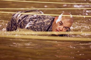 Keywords: man army training military water rigorous exercise hard wire rope wet drenched nature outside