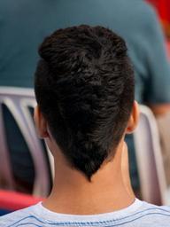 Keywords: man haircut hairstyle v-cut guy hair looking away