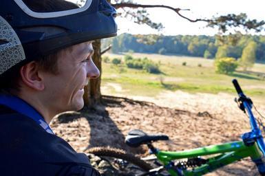 Keywords: man human face person eyes expression background boke hobby emotion cheerful happy tree meadow mountain bike colorful creative skills turquoise green yellow sun close energy helm