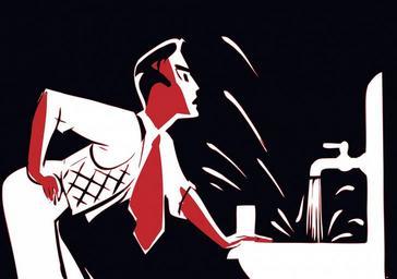 Keywords: man male washing bathing basin wash basin water tap splash cross angry red face art fun humour