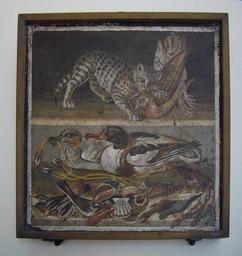 | Keywords: MAN mosaici animali da Pompei 1040618.JPG Napoli Museo Archeologico Nazionale inv nr 9993 mosaico da Pompei Casa del Fauno Sono rappresentati su due registri sovrapposti quello superiore un gatto che agguanta un pollo; quello inferiore una natura morta che rappresenta tutto quello che i Romani amavano sulla loro tavola due anatre qui con boccioli di fiori di loto nel becco quattro uccelletti legati per le zampe conchiglie e frutti di mare pesci diversi Own Lalupa Other versions <gallery> File MAN mosaici animali da Pompei 1040618 JPG Museo Archeologico Naples File Mosaic cat ducks Massimo Inv124137 jpg Palazzo Massimo Rome File Vatican Museum mosaic 4 jpg Vatican Museum Vatican City </gallery> PD-old-100 self GFDL cc-by-sa-3 0 2 5 2 0 1 0 Mosaics from the House of the Faun Pompeii 9993 Mosaics of cats Mosaics of ducks Mosaics of birds Mosaics of shells Mosaics of fish Cats in ancient Roman mosaics Birds in ancient Roman mosaics |