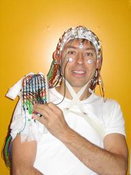 Keywords: man person eeg study eeg investigation doctor study cabling view electrodes funny wissenschenschaft technology research arm head clinical trials subject attempt experiment guinea pig electric chair