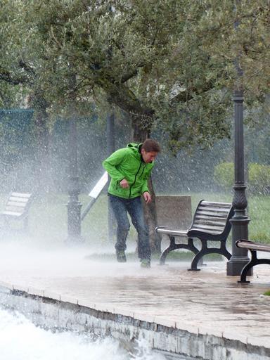 Keywords: man person get wet inject downpour soaked wave wet lake spray water garda promenade flooded taken flood