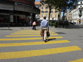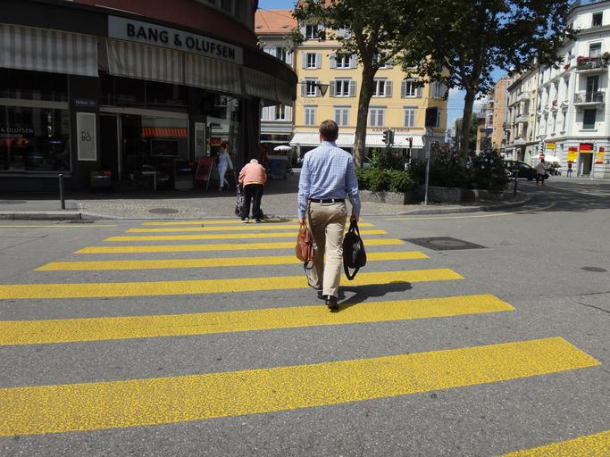 Keywords: man person zebra crossing crossing yellow stripes zurich generations
