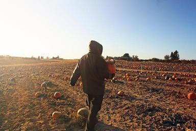 Keywords: man pumpkin patch selecting dusk halloween farm october season vegetable