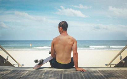 Keywords: man sitting back skateboard steps beach sand island young man caucasian boy male skateboarding leisure
