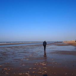 Keywords: man walk water sea beach motion people blue sky rest hiking