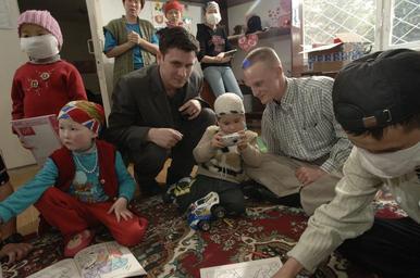 | Keywords: Manas Air Base Outreach Society DVIDS18410.jpg en Staff Sgt Noah Bolton sits with one of many avid child photographers in the visitation room of the Kyrgyz Republic Cancer Center Mr Savva Mazroyanidi left of center provides English - Russian language interpretation transportation and support for all to enjoy the visit Staff Sgt Bolton a Heating Ventilation and Air Conditioning specialist native to Republic Missouri and deployed 376th Expeditionary Civil Engineering Squadron Manas Air Base Kyrgyz Republic from the 509th Civil Engineering Squadron Whiteman Air Force Base Mo is participating in the Manas Air Base Outreach Society MABOS This is facility is the only national cancer center in the Kyrgyz Republic and is one of the MABOS focus group locations The ward houses 40 patients in 9 rooms but because of the distance and cost to travel there a parent of each child stay in residence with them for the one-year treatment of various kinds of cancer making 80 people in residence Despite the crowded living conditions the cancer center reports a 70 recovery rate of early-diagnosed cancer Although government funded the money does not pay for all the costs Damiria Omoorzakovna principal and lead doctor spends most of her time raising funds for the center Recent donations include from an Italian football captain for 200 000 in bone marrow operations Another is 3 000 000 dollars from the Italian government for a new facility but more is needed to cover the total cost U S Air Force photo/Master Sgt Lance Cheung 2006-03-19 Lance Cheung https //www dvidshub net/image/18410 18410 2006-04-19 14 44 BISHKEK KG PD-USGov Images from DoD uploaded by Fæ 376th Air Expeditionary Wing United States Air Force Transit Center at Manas |