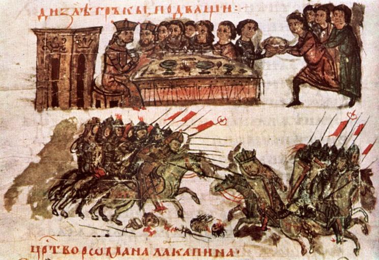 | Keywords: ManassesKonstantinosAndSymeon.jpg  Бълга ски  иниатю а 60 от  анасиевата летопис 14 век Угощение на ца Симеон в Константинопол и бълга ско нападение над  омеите English Miniature 60 from the Constantine Manasses Chronicle 14 century Feast in Constantinople in the honour of tsar Simeon and a Bulgarian attack upon the Romans Manasses Chronicle - Vatican manuscript Original 14 century Original Constantine Manasses Скани ана от книгата  иниатю и на  анасиевата летопис Иван Дуйчев Издателство Бълга ски художник София 1962 Scanned from book Miniatures from the Manasses Chronicle Ivan Duichev Bulgarski hudojnik Publishing house Sofia 1962 PD-Art PD-art Simeon I of Bulgaria Constantine Manasses Chronicle Byzantine cavalry |