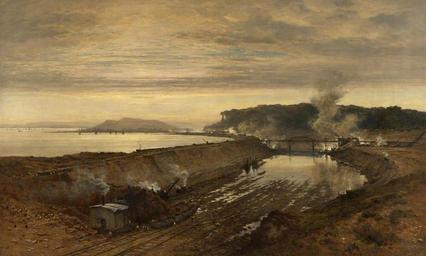 | Keywords: Manchester Ship Canal The Making of Eastham Dock.jpg Artwork Creator Benjamin Williams Leader en A painting by Benjamin Williams Leader in 1891 of the Manchester Ship Canal being built The painting focuses on the building of Eastham Docks see http //books google co uk/books id Sks583w0MXkC pg PA79 dq 22manchester+ship+canal 22+land+purchase hl en ei UWh2Tpa5F4Sp8APTopnCBA sa X oi book_result ct result resnum 7 ved 0CF4Q6AEwBjge v onepage q f false this link for more information 1891 oil canvas cm 112 184 Gallery Oldham accession number 13 27/1 object history credit line gift from Miss Platt 1927 exhibition history http //www bbc co uk/arts/yourpaintings/paintings/manchester-ship-canal-the-making-of-eastham-dock-90716 BBC Your Paintings PD-old-100 Uploaded with UploadWizard Benjamin Williams Leader Gallery Oldham Manchester Ship Canal Bebington Images from BBC Your Paintings Docks in England Construction in Cheshire |