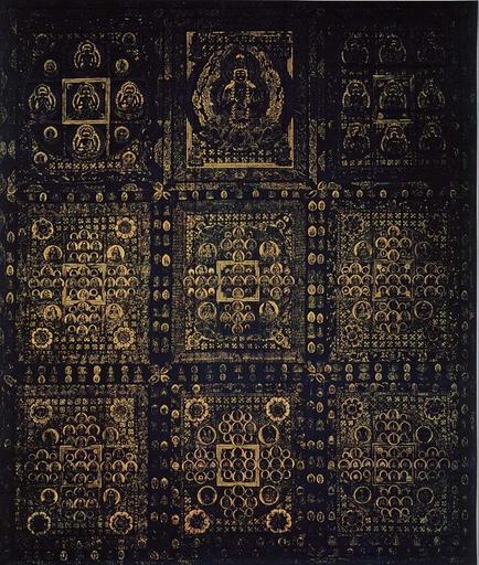 Keywords: Mandala of the Diamond Realm Kojimadera.jpg Mandala of the Two Realms 紺綾 金 泥絵両界曼荼羅図 konayajikingindeie ryōkaimandarazu at Kojimadera 子嶋寺 Takatori Nara Japan One of two hanging scrolls Gold and silver paint on dark blue silk The scrolls have been designated as National Treasure of Japan in the category paintings http //bell jp/pancho/k_diary-2/2008_11_26 htm author early 11th century PD-old-100 PD-Japan Mandala of the Two Realms Kojima-dera |