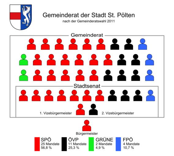 Keywords: Mandatsverteilung Gemeinderat und Stadtsenat St Poelten 2011.svg Mandatsverteilung im Gemeinderat und Stadtsenat St Pöltens nach der Gemeinderatswahl 2011 own 2012-02-25 AleXXw PD-release St Pölten