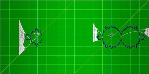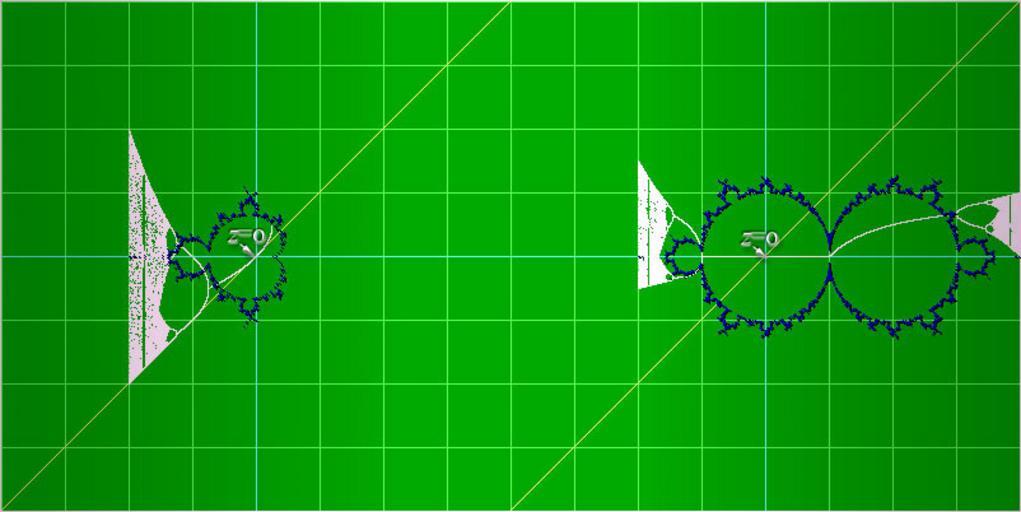 | Keywords: Mandel-bifurk.jpg Comparsion of the functions of the Mandelbrot set and a bifurcation diagram The function for the Mandelbrot-set is Z<sub>n+1</sub> Z<sub>n</sub><sup>2</sup> + C The function for the standard bifucation-diagram is X<sub>n+1</sub> A · X<sub>n</sub> · 1 - X<sub>n</sub> The Mandel-formula is using a complex-number format the bifurcation is using real numbers But the formulas can be altered to the diffrent form and used to write the Mandel as a bifurcation and the bifurcation as a complex escape-time fractal The real number Mandel formula is X<sub>n+1</sub> X<sub>n</sub><sup>2</sup> + A And the complex bifurcation function is Z<sub>n+1</sub> C · Z<sub>n</sub> · 1 - Z<sub>n</sub> The image above shows all four variations to the left the Mandelbort formula as a bifurcation diagram in white and also the complex escape-time visulation of the complex formula in blue to the right the same for the standar there are a lot of those bifurcation formula and as we can see these formulas are strongly related Solkoll 2D Mandelbrot set properties badjpg |