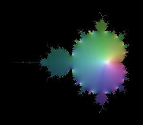 | Keywords: Mandelbrot-Iterate-19.jpg The diagram shows the part of the complex plane ranging from “2 2 to 1 on the real axis horizontal and from “1 4i to 1 4i on the imaginary axis vertical The color for a point <math>c</math> in the plane is the color coded value of the function <math>f \ n _c 0 \quad\text for n 19\quad\text and f_c z z 2+c</math> Note that the exponent refers to <math>f</math> as a function and not to its value i e <math>f</math> <math> n</math> denotes n-fold applying <math>f</math> <math>f \ n f\circ f\circ \cdots \circ f</math> So <math>f</math> <math> n</math> is an element of the sequence <math>\begin align f_c \ 0 \ \; z \mapsto z\\ f_c \ 1 \ \; z \mapsto z 2+c\\ f_c \ 2 \ \; z \mapsto z 2+c 2+c\\ f_c \ 3 \ \; z \mapsto z 2+c 2+c 2+c\\ \;\;\vdots \end align </math> For <math>n>0</math> the function <math>f_c n 0 </math> is a polynomial of degree <math>2 n-1 </math> in <math>c</math> Therefore it has <math>2 n-1 </math> zeros in the complex plane It turns out that all zeros are distinct Moreover the zeros are located in a disc around the origin whose diamater does not depend on <math>n</math> Das Diagramm zeigt einen Teil der komplexen Zahlen mit Realteil zwischen “2 2 to 1 horizontal und Imaginärteil zwischen “1 4i und 1 4i vertikal Die Farbe eines Punktes <math>c</math> der Ebene ist der farbcodierte Wert der Funktion <math>f \ n _c 0 \quad\text mit n 19\quad\text und f_c z z 2+c</math> Hierbei bezieht sich der Exponent auf <math>f</math> als Funktion und nicht auf deren Funktionswert d h <math>f</math> <math> n</math> steht fĂĽr die n-fache HintereinanderausfĂĽhrung von <math>f</math> <math>f \ n f\circ f\circ \cdots \circ f</math> Es ist <math>f</math> <math> n</math> also ein Glied der Folge <math>\begin align f_c \ 0 \ \; z \mapsto z\\ f_c \ 1 \ \; z \mapsto z 2+c\\ f_c \ 2 \ \; z \mapsto z 2+c 2+c\\ f_c \ 3 \ \; z \mapsto z 2+c 2+c 2+c\\ \;\;\vdots \end align </math> FĂĽr <math>n>0</math> ist die Funktion <math>f_c n 0 </math> ein Polynom vom Grade <math>2 n-1 </math> in <math>c</math> Somit hat die Funktion <math>2 n-1 </math> Nullstellen die alle verschieden sind Zudem liegen alle Nullstellen in einem Kreis dessen Größe unabhängig von <math>n</math> ist Self made using a throw-away C program 2008-03-24 Georg-Johann Lay Images of the sequence for n 1 20 0 cellpadding 1 cellspacing 1 - 110px thumb left 1 color map 110px thumb left 2 110px thumb left 3 110px thumb left 4 110px thumb left 5 - 110px thumb left 6 110px thumb left 7 110px thumb left 8 110px thumb left 9 110px thumb left 10 - 110px thumb left 11 110px thumb left 12 110px thumb left 13 110px thumb left 14 110px thumb left 15 - 110px thumb left 16 110px thumb left 17 110px thumb left 18 110px thumb left 19 110px thumb left 20 From step to step the number of zeros white is doubling The zeros are chaotically scattered around in a disc whose diameter does not depend on <math>n</math> For values of <math>c</math> that belong the the Mandelbrot set <math>M</math> the sequence <math>f 1_c 0 \; f 2_c 0 \; f 3_c 0 \ \ldots </math> is bounded For values not in <math>M</math> the sequence tends to infinity black Values of <math>c</math> located in the body of <math>M</math> ” the big cardioid ” lead to sequences that converge to a definite complex number In other words these values converge to a cycle of period 1 Values in the head of <math>M</math> ” the big circle at the left of the body ” tend to periodoc cycles of period 2 This can be seen in the sequence of images because the head changes its color from bright to dark and vice versa from step to step Values located in the small bulbs ” the hands symetrically arranged to the body ” tend to periodic cycles of period 3 and so on Von Schritt zu Schritt verdoppelt sich die Anzahl der Nullstellen weiĂź Die Nullstellen sind chaotisch verstreut in einem begrenzten Gebiet dessen Größe nicht von <math>n</math> abhängt FĂĽr Werte <math>c</math> in der Mandelbrot-Mengem <math>M</math> sind die Folgen <math>f 1_c 0 \; f 2_c 0 \; f 3_c 0 \ \ldots </math> beschränkt FĂĽr Werte ausserhalb von <math>M</math> streben die Folgen gegen Unendlich schwarz Werte im Körper von<math>M</math> ” dem Zykloid ” fĂĽhren zu konvergenten Folgen Mit anderen Worten die zugehörigen Folgewerte konvergieren gegen periodische Zykel der Länge 1 Werte im Kopf von <math>M</math> ” dem groĂźen Kreis links am Körper ” streben gegen periodische Zykel der Länge 2 Dies sieht man daran daĂź der Kopf mit jeden Bild seine Farbe von hell nach dunkel wechselt Werte in den Ă„rmchen ” den grösseren Kreisen links und rechts des Körpers ” fĂĽhren zu Folgen deren Grenzzyklen Periode 3 hat usw Coloring complex numbers To color a complex value the function described in <ref>Visualising complex functions</ref> is used with the parameters <math>\begin align a_s 0 6 \ b_s 0 5 \\ a_v 0 4 \ b_v 0 3 \\ \end align </math> and with S and V interchanged Zeros turn to white and infinity to black Zum Färben komplexer Zahlen verwende ich die Methode wie beschrieben in<sup>1</sup> mit den Parametern <math>\begin align a_s 0 6 \ b_s 0 5 \\ a_v 0 4 \ b_v 0 3 \\ \end align </math> und mit vertauschten Rollen von S und V Die Null wird zu WeiĂź und Unendlich zu Schwarz References <references/> Complex color plots of Mandelbrot iterations Order 19 |