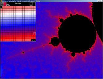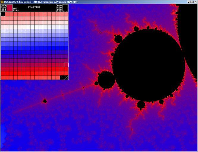 | Keywords: Mandelbrot palette colour editing with Fractint.png Fractint This image shows freeware DOS program Fractint version 20 0 running in 256 colour mode inside DOSBOX 0 72 on Windows Vista Fractint's palette editor is shown in the top left corner The small black cross-hairs in the top centre of the fractal have selected a single pixel and the palette editor's top left box shows the RGB values and colour of that pixel red The position of that colour in the palette is shown by a white bordered box in the matrix below This region of the Mandelbrot set is the same as File Mandelbrot fractint red png but after its colour palette was changed Own 2009-04-01 84user Coordinates of the center Re c -0 734 959 673 066 9599 Im c 0 197 046 620 952 412 Horizontal diameter of the image 0 0000117948426 Magnification relative to the initial image 2 26087515e+5 Created by 84user with the program Fractint version 20 0 under DOSBox 0 72 emulating DOS on Windows Vista Uploaded by the creator See also thumb left same region with a blue colour palette thumb center same region with a different colour palette clr Near-copies of the Mandelbrot set within itself Fractals created with Fractint DOSBox ImageNote 1 501 150 41 41 1029 791 2 LangSwitch cross-hairs selecting pixel ImageNoteEnd 1 ImageNote 2 3 20 99 43 1029 791 2 LangSwitch RGB values and colour of selected pixel ImageNoteEnd 2 ImageNote 3 331 323 25 31 1029 791 2 LangSwitch 207 palette location of selected pixel colour ImageNoteEnd 3 |