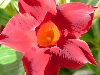 Keywords: mandevilla bell shaped funnel flower blossom bloom red orange trumpet shaped funnel like neotropical liana climber semi shrub dog gift greenhouse apocynaceae crop garden plant mandevilla sanderi dipladenia funnel trichterförmig trumpet like bright fiery velvety red velvety sundaville tropidenia stans flower