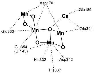 | Keywords: Manganese cluster.svg en manganese-cluster Mn4-Ca of the oxygen evolving complex in photosynthesis The exact geometry is still elusive de Mangan-Ca-Cluster der sauerstoffproduzierenden Kommplexes in der Photosynthese Die genaue Anordnung ist noch nicht bekannt PMID 17082458 Yikrazuul 2009-05-15 Photosynthesis SVG photosynthesis |