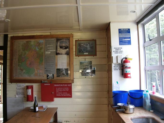 Keywords: Mangaturuturu Hut 6.jpg Interior of the Mangaturuturu Hut in the Tongariro NP <br>Electric light fire extinguisher sink table maps 2013-03-25 Own Sarang Mangaturuturu Hut