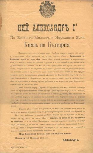 | Keywords: Manifest-serbo-bulgarian-war.jpg анифест на княз Александъ І за обявяване на война на Съ бия в 1885 година Manifesto of Knyaz en Alexander of Bulgaria declaring the en Serbo-Bulgarian War own scanned 1885-11-02 Bulgarian head of state English translated text <center>We Alexander I</center> <center>By the Grace of God and the Will of the Nation</center> <center>Prince of Bulgaria</center> The government of our neighbouring Serbian people led by personal and selfish purposes willing to nullify the sacred cause the Unification of Bulgarian people as a whole today without any legitimate and just reason declared war to our Country and ordered his troops to invade our land With great sorrow We understood this sad information as We could never believe that our blood and faith brothers would have taken the arms and begun a fratricidal war in the difficult times the little countries of the Balkan Peninsula are undergoing and that they would act so inhumanly and impiously towards their own neighbours which without damaging anyone are working and fighting for a right noble and praiseworthy cause As we leave to the Serbs and their government all responsibility of this fratricidal war between two brotherly peoples and of the horrible results that could affect both countries We communicate to our beloved people that We have accepted the war declared by the Serbs and We gave our valiant and heroic troops the order to begin our operations against the Serbs and to boldly defend Bulgarian people s land honour and freedom Our cause is sacred and We hope that God will take it under its protection and will grant us the necessary strength to win out and to defeat our enemies As We are sure that our beloved people will hasten to help us for the difficult for the holy cause the defence of our land against the enemy s invasion and that every Bulgarian able to take arms will come under our flag to fight for his own fatherland and freedom We appeal the Highest so that he may protect and watch over Bulgaria and that he may help us in these difficult and hard times which our country is undergoing May the Highest Lord God help us Plovdiv 2nd November 1885 Testo tradotto in italiano <center>Noi Alessandro I</center> <center>Per Grazia di Dio e Volontà della Nazione</center> <center>Principe della Bulgaria</center> Il governo del popolo Serbo nostro vicino guidato da propositi personali ed egoistici desideroso di vanificare la sacra causa l Unificazione del popolo bulgaro in un unico insieme oggi senza alcun motivo legittimo e giusto ha dichiarato guerra al nostro Paese ed ha dato ordine alle proprie truppe di invadere la nostra terra Con grande dolore abbiamo appreso questa triste notizia poiché mai avremmo creduto che i nostri fratelli di sangue e di credo avrebbero preso le armi ed iniziato una guerra fratricida in questi tempi difficili che i piccoli paesi della Penisola Balcanica stanno attraversando e che si sarebbero rivolti in modo così disumano ed empio nei confronti dei propri vicini che senza cagionare danno a nessuno lavorano e lottano per una causa giusta nobile e lodevole Lasciando ai Serbi ed al loro governo tutta la responsabilità della guerra fratricida tra due popoli fratelli e delle orribili conseguenze che potrebbero succedere ad entrambi i paesi Noi dichiariamo al nostro amato popolo che abbiamo accettato la guerra dichiarata dai Serbi e abbiamo dato ordine alle nostre valorose ed eroiche truppe di dare inizio alle operazioni contro i Serbi e di difendere coraggiosamente la terra l onore e la libertà del popolo Bulgaro La nostra causa è sacra e speriamo che Dio la accolga sotto la sua protezione e ci dia la forza necessaria per trionfare e per sconfiggere i nostri nemici Essendo sicuri che il nostro amato popolo accorrerà per sostenerci nella difficile nella sacra causa la difesa della nostra terra dall invasione del nemico e che ogni Bulgaro in grado di prendere le armi verrà sotto la bandiera per battersi per la propria patria e la libertà invochiamo l Altissimo affinché protegga e vegli sulla Bulgaria e che ci aiuti nei tempi duri e difficoltosi che il nostro paese sta passando Possa Nostro Signore Dio Altissimo aiutarci Plovdiv li 2 novembre 1885 PD-old Alexander I of Bulgaria Serbo-Bulgarian war of 1885 1885 texts 2 November |