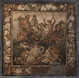 | Keywords: MANNapoli 10007 Mosaic Poseidon & Amphitrite Pompeii.jpg author fr mosaïque quadrangulaire détachée du revêtement de sol encadrée de marbre Dans un cadre de feuilles sortent quatre rubans noués Neptune et Amphitrite sont dans un char nuptial tiré par deux Tritons dont l'un joue d'un tuba double et l'autre de la lyre Un cupidon repose sur les genoux de la déesse Dessous Amphitrite en robe de mariée assis sur un dragon de mer est précédée d'un triton jouant de la lyre et est accompagné d'une Néréide tandis qu'un cupidon fouette la queue du dragon IIème siècle av J -C basalte calcaire opus vermiculatum 93cm x 93cm institution Naples National Archaeological Museum place of discovery Pompeii IX 2 27 DEL GRANDUCA DI TOSCANA object history exhibition history credit line accession number 10007 place of creation Pompeii own PD-old cc-zero QualityImage Mosaics from Pompeii in the Museo Archeologico Nazionale in Naples Mosaics of Poseidon Amphitrite Marriage in art Cupido Quality images of Naples Quality images by Jebulon |