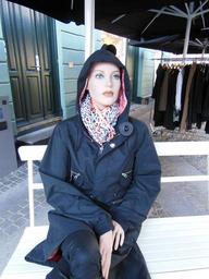 Keywords: mannequin doll sitting bench fashion clothes black coloured sccarf outdoor