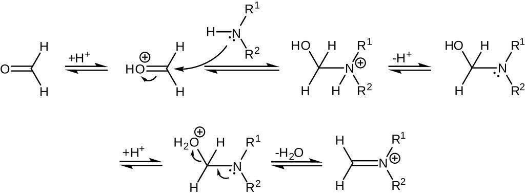 Keywords: Mannichreactionmech1.svg Mannich reaction mechanism part 1 Own 2008-04-18 TommyCP This image is public domain Mannich reaction