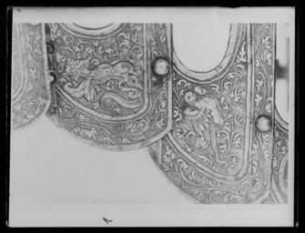 | Keywords: Manpansar, möjligen tillhörigt Johan III, 1500-talets mitt - Livrustkammaren - 2413.tif LSH artwork sv Driven stålplåt med heltäckande etsad dekor Insidan svärtad med tydliga slagmärken Bestående av elva U-formiga skenor ökande i längd bakåt Skenorna lagda omlott och sammanfogade i varandra med längsgående 25 mm breda band av gulvitt sämskat skinn fästade med en nit i var skena På var sida en urtagning rektangulär med rundad nedre kant och vid sidan om denna en dekorativ nit med kullrig gulmetallhätta Kanterna nertill lätt rundade och baktill fasade Första skenan med insvängda sidor i mitten 24 mm långt spärrstift och längs yttre kanten genomgående hål i rad Sista skenans yttre kant omvikt rundsmidd och repstavsfilad bredd ca 15 mm Etsad dekor blanka figurer mot mörk bakgrund På nedre delen fabliska djur och porträtt inom ovaler omgärdat av slingrande växtrankor På övre delen olika motiv som stående lejon ställda mot varandra och mytologiska scener allt omgärdat av slingrande rankor original caption mid other date century 16 brass - leather Färg gulvit material läder - steel Färg blankt svart material stål size mm 780 330 LRK Johan III av Sverige Hästen 1991 Tre Konungar på Åbo slott 1993 Björneborg - Johans stad Satakunta Museum Björneborg/Pori 2008 Trofast - hov och tass i kunglig tjänst 2010-2011 Livrustkammaren Trogna vänner - Kungliga hästar och hundar 2011-2012 Museiverket/Finlands nationalmuseum place of origin original filename LN_E02896 59502 inventory number LRK 22860 2413 CC0 Manpansar möjligen tillhörigt Johan III 1500-talets mitt - Livrustkammaren - 2413-negative tif <gallery caption Different images of same object > File Manpansar möjligen tillhörigt Johan III 1500-talets mitt - Livrustkammaren - 19537 tif File Manpansar möjligen tillhörigt Johan III 1500-talets mitt - Livrustkammaren - 79458 tif File Manpansar möjligen tillhörigt Johan III 1500-talets mitt - Livrustkammaren - 36657 tif File Manpansar möjligen tillhörigt Johan III 1500-talets mitt - Livrustkammaren - 62337 tif File Manpansar möjligen tillhörigt Johan III 1500-talets mitt - Livrustkammaren - 70899 tif File Manpansar möjligen tillhörigt Johan III 1500-talets mitt - Livrustkammaren - 53776 tif File Manpansar möjligen tillhörigt Johan III 1500-talets mitt - Livrustkammaren - 45215 tif File Manpansar möjligen tillhörigt Johan III 1500-talets mitt - Livrustkammaren - 10973 tif File Manpansar möjligen tillhörigt Johan III 1500-talets mitt - Livrustkammaren - 35519 tif File Manpansar möjligen tillhörigt Johan III 1500-talets mitt - Livrustkammaren - 28096 tif </gallery> <gallery caption Related objects > File Ländpansar till hästrustning troligen tillhörigt Johan III 1500-tal - Livrustkammaren - 79460 tif LRK 22862 File Ländpansar till hästrustning troligen tillhörigt Johan III 1500-tal - Livrustkammaren - 36659 tif LRK 22862 File Bogpansar till hästrusning troligen tillhörigt Johan III 1500-tal - Livrustkammaren - 35526 tif LRK 22861 File Ländpansar till hästrustning troligen tillhörigt Johan III 1500-tal - Livrustkammaren - 70895 tif LRK 22862 File Bogpansar till hästrusning troligen tillhörigt Johan III 1500-tal - Livrustkammaren - 44085 tif LRK 22861 File Bogpansar till hästrusning troligen tillhörigt Johan III 1500-tal - Livrustkammaren - 79454 tif LRK 22861 File Utställningsbild sadlar hästrustningar mm - Livrustkammaren - 77173 tif LRK 22861 File Ländpansar till hästrustning har troligen tillhört Johan III 1500-tal - Livrustkammaren - 10975 tif LRK 22862 File Ländpansar till hästrustning troligen tillhörigt Johan III 1500-tal - Livrustkammaren - 2415 tif LRK 22862 </gallery> Horse armours Media contributed by LSH 2016-12 |
