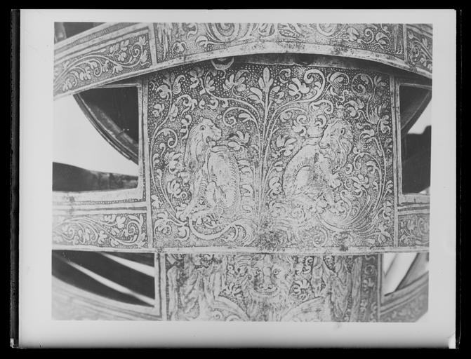 | Keywords: Manpansar, möjligen tillhörigt Johan III, 1500-talets mitt - Livrustkammaren - 45215.tif LSH artwork sv Driven stålplåt med heltäckande etsad dekor Insidan svärtad med tydliga slagmärken Bestående av elva U-formiga skenor ökande i längd bakåt Skenorna lagda omlott och sammanfogade i varandra med längsgående 25 mm breda band av gulvitt sämskat skinn fästade med en nit i var skena På var sida en urtagning rektangulär med rundad nedre kant och vid sidan om denna en dekorativ nit med kullrig gulmetallhätta Kanterna nertill lätt rundade och baktill fasade Första skenan med insvängda sidor i mitten 24 mm långt spärrstift och längs yttre kanten genomgående hål i rad Sista skenans yttre kant omvikt rundsmidd och repstavsfilad bredd ca 15 mm Etsad dekor blanka figurer mot mörk bakgrund På nedre delen fabliska djur och porträtt inom ovaler omgärdat av slingrande växtrankor På övre delen olika motiv som stående lejon ställda mot varandra och mytologiska scener allt omgärdat av slingrande rankor original caption mid other date century 16 brass - leather Färg gulvit material läder - steel Färg blankt svart material stål size mm 780 330 LRK Johan III av Sverige Hästen 1991 Tre Konungar på Åbo slott 1993 Björneborg - Johans stad Satakunta Museum Björneborg/Pori 2008 Trofast - hov och tass i kunglig tjänst 2010-2011 Livrustkammaren Trogna vänner - Kungliga hästar och hundar 2011-2012 Museiverket/Finlands nationalmuseum place of origin original filename LN_E02891 59502 inventory number LRK 22860 45215 CC0 Manpansar möjligen tillhörigt Johan III 1500-talets mitt - Livrustkammaren - 45215-negative tif <gallery caption Different images of same object > File Manpansar möjligen tillhörigt Johan III 1500-talets mitt - Livrustkammaren - 19537 tif File Manpansar möjligen tillhörigt Johan III 1500-talets mitt - Livrustkammaren - 79458 tif File Manpansar möjligen tillhörigt Johan III 1500-talets mitt - Livrustkammaren - 36657 tif File Manpansar möjligen tillhörigt Johan III 1500-talets mitt - Livrustkammaren - 62337 tif File Manpansar möjligen tillhörigt Johan III 1500-talets mitt - Livrustkammaren - 70899 tif File Manpansar möjligen tillhörigt Johan III 1500-talets mitt - Livrustkammaren - 53776 tif File Manpansar möjligen tillhörigt Johan III 1500-talets mitt - Livrustkammaren - 10973 tif File Manpansar möjligen tillhörigt Johan III 1500-talets mitt - Livrustkammaren - 35519 tif File Manpansar möjligen tillhörigt Johan III 1500-talets mitt - Livrustkammaren - 2413 tif File Manpansar möjligen tillhörigt Johan III 1500-talets mitt - Livrustkammaren - 28096 tif </gallery> <gallery caption Related objects > File Ländpansar till hästrustning troligen tillhörigt Johan III 1500-tal - Livrustkammaren - 79460 tif LRK 22862 File Ländpansar till hästrustning troligen tillhörigt Johan III 1500-tal - Livrustkammaren - 36659 tif LRK 22862 File Bogpansar till hästrusning troligen tillhörigt Johan III 1500-tal - Livrustkammaren - 35526 tif LRK 22861 File Ländpansar till hästrustning troligen tillhörigt Johan III 1500-tal - Livrustkammaren - 70895 tif LRK 22862 File Bogpansar till hästrusning troligen tillhörigt Johan III 1500-tal - Livrustkammaren - 44085 tif LRK 22861 File Bogpansar till hästrusning troligen tillhörigt Johan III 1500-tal - Livrustkammaren - 79454 tif LRK 22861 File Utställningsbild sadlar hästrustningar mm - Livrustkammaren - 77173 tif LRK 22861 File Ländpansar till hästrustning har troligen tillhört Johan III 1500-tal - Livrustkammaren - 10975 tif LRK 22862 File Ländpansar till hästrustning troligen tillhörigt Johan III 1500-tal - Livrustkammaren - 2415 tif LRK 22862 </gallery> Horse armours Media contributed by LSH 2016-12 |