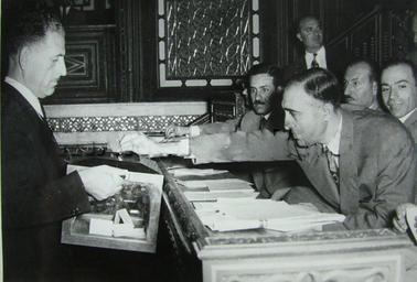 | Keywords: Mansur Al-Atrash2.jpg ar نواب البعث صلاح البيطار ومنصور الأطرش يدليان بصوتهما في إنتخابات الرئاسة عام 1955 en Baath MPs Salah al-Bitar and Mansour al-Atrash voting in Parliament - 1955 fr Députés du Baath Salah al-Bitar et Mansour Al-Atrache votent aux Élection présidentielle - 1955 1955 http //www syrianhistory com/ar/photos/6359 unknown other versions Custom license marker 2016 10 31 PD-Syria Mansur Al-Atrash | ||||